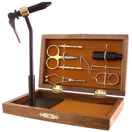Terra Royal Coachman Fly Tying Tool Kit Wapsi Fly The Terra Royal Coachman Fly Tying Tool Kit includes quality fly tying tools perfect for the beginner and the seasoned fly tyer alike. This tool kit is great for the traveling angler as the entire package is housed in a handsome 8" X 5" X 1 9/16" wood box. This kit includes a Royal Coachman vise with built-in base Iris scissors a ceramic thread bobbin a bobbin threader a bodkin with half hitch tool a rotating whip finisher a hair stacker hackle pliers and a wood travel/storage box.